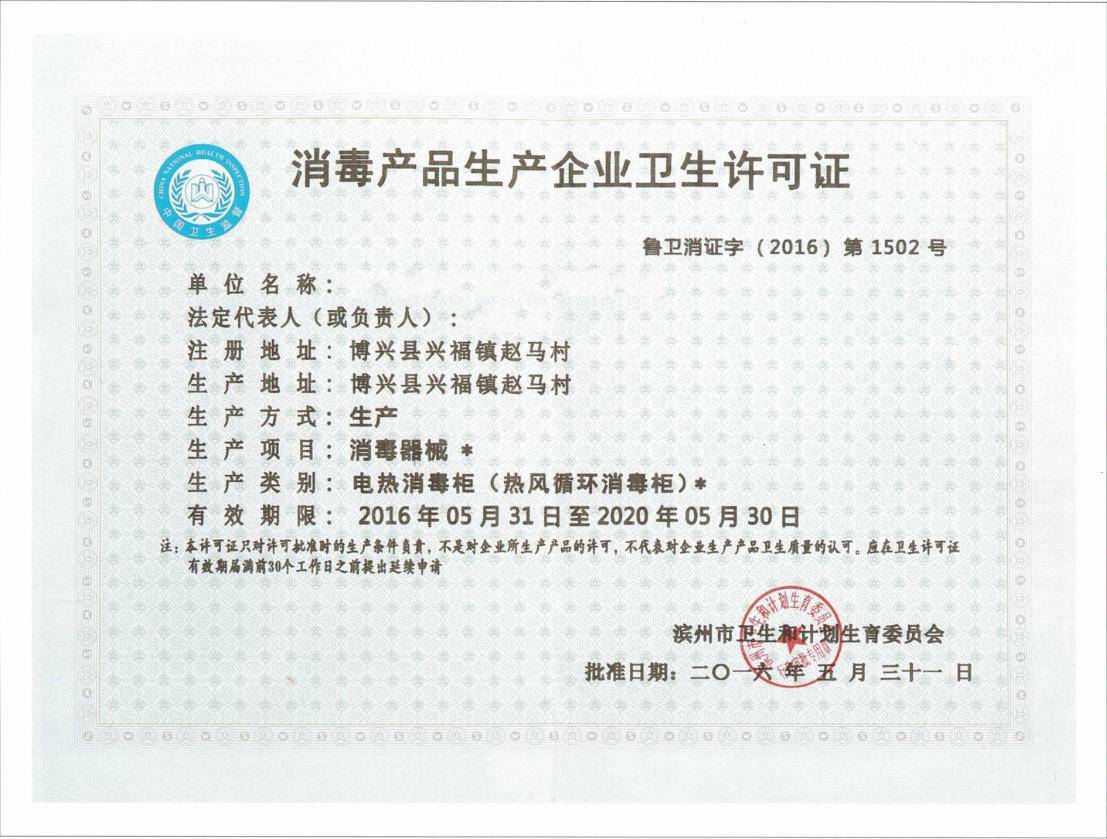 消毒产品生产企业卫生许可证